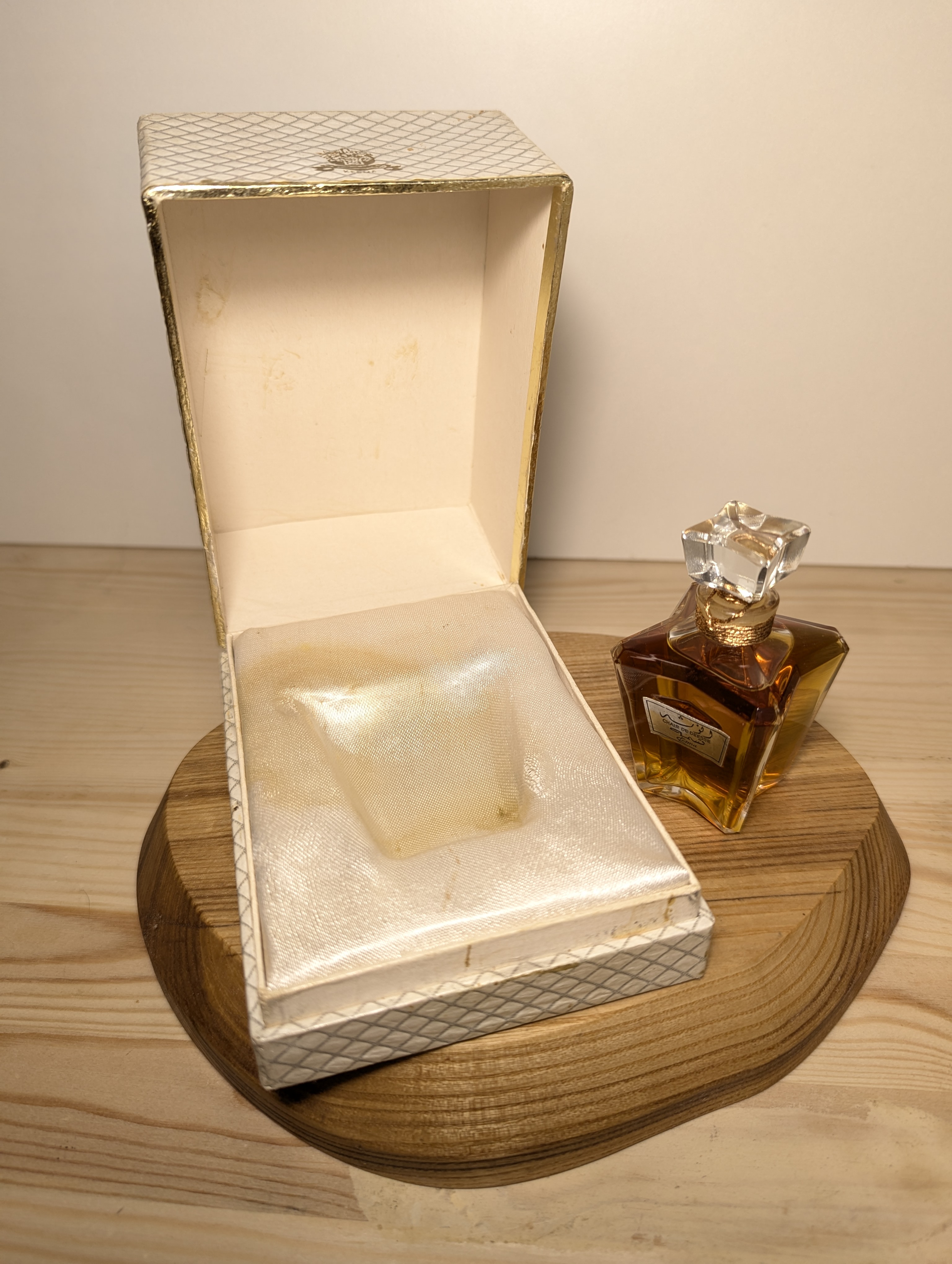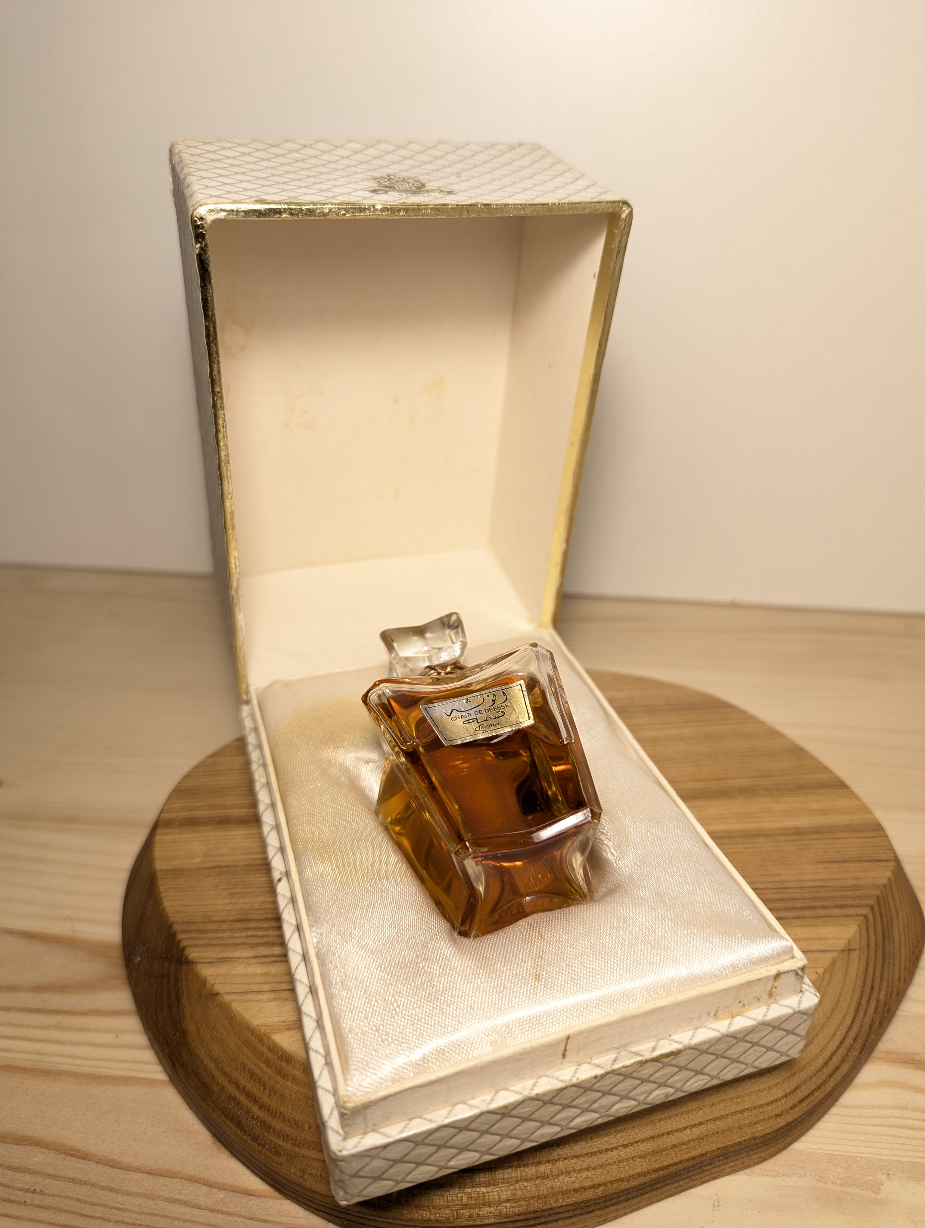 Kesma Chair de Déesse — редкий винтажный аромат с тёплым, бархатным звучанием восточных специй, ванили и амбры. Чувственный, таинственный, будто прикосновение богини — для женщин, ценящих экзотику и глубину. Идеален для вечера и холодного сезона.Духи Kesma Chair de Deesse 30 мл винтаж 1960-х годов сплэш пломба