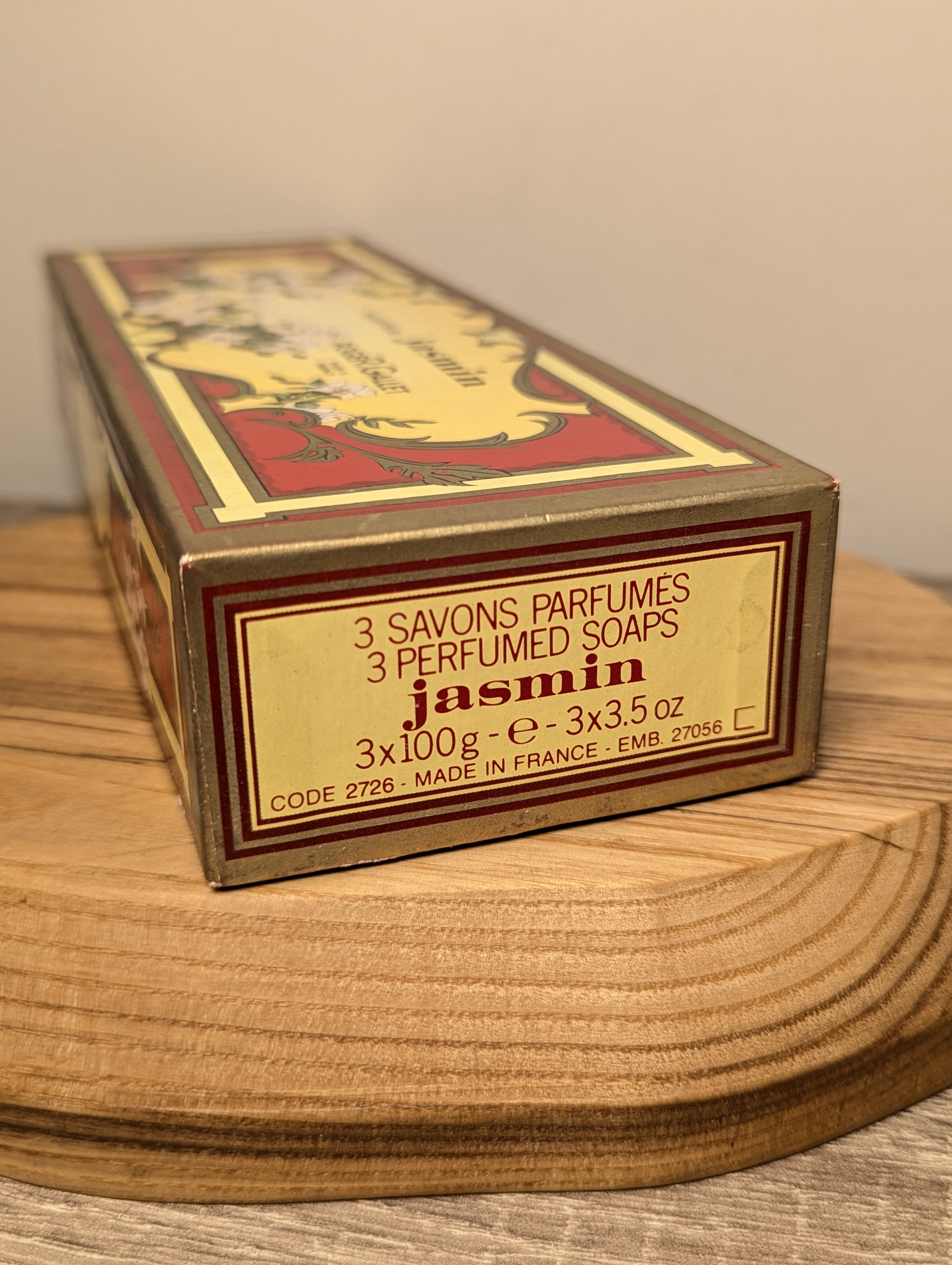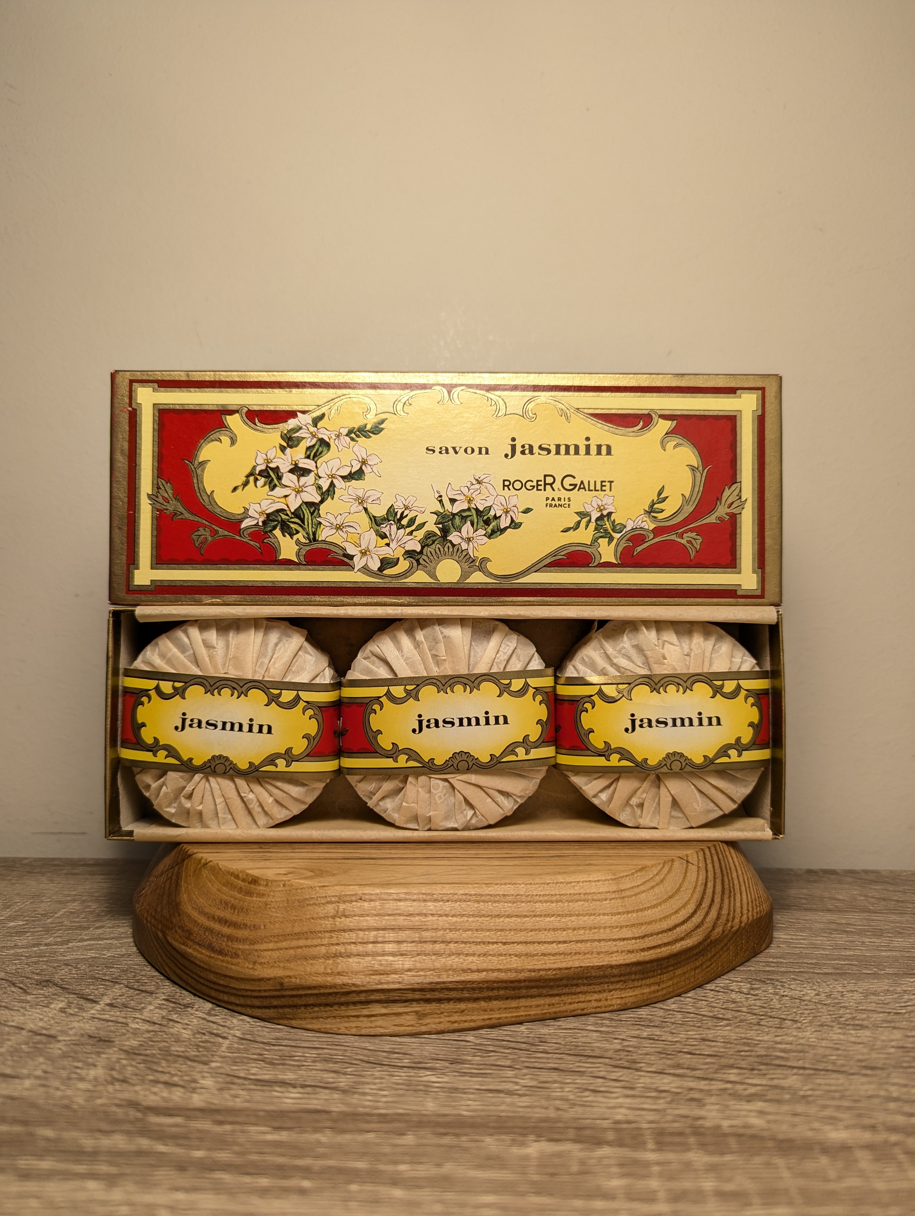 Винтажный набор из 3 парфюмированных мыл от Roger & Gallet — роскошь для ценителей аромата жасмина: шелковистая пена, стойкий нежный аромат жасминового цвета. Подходит коллекционерам, ценителям ретро и французской парфюмерной школы и тем, кто ищет изысканный подарок «с историей».