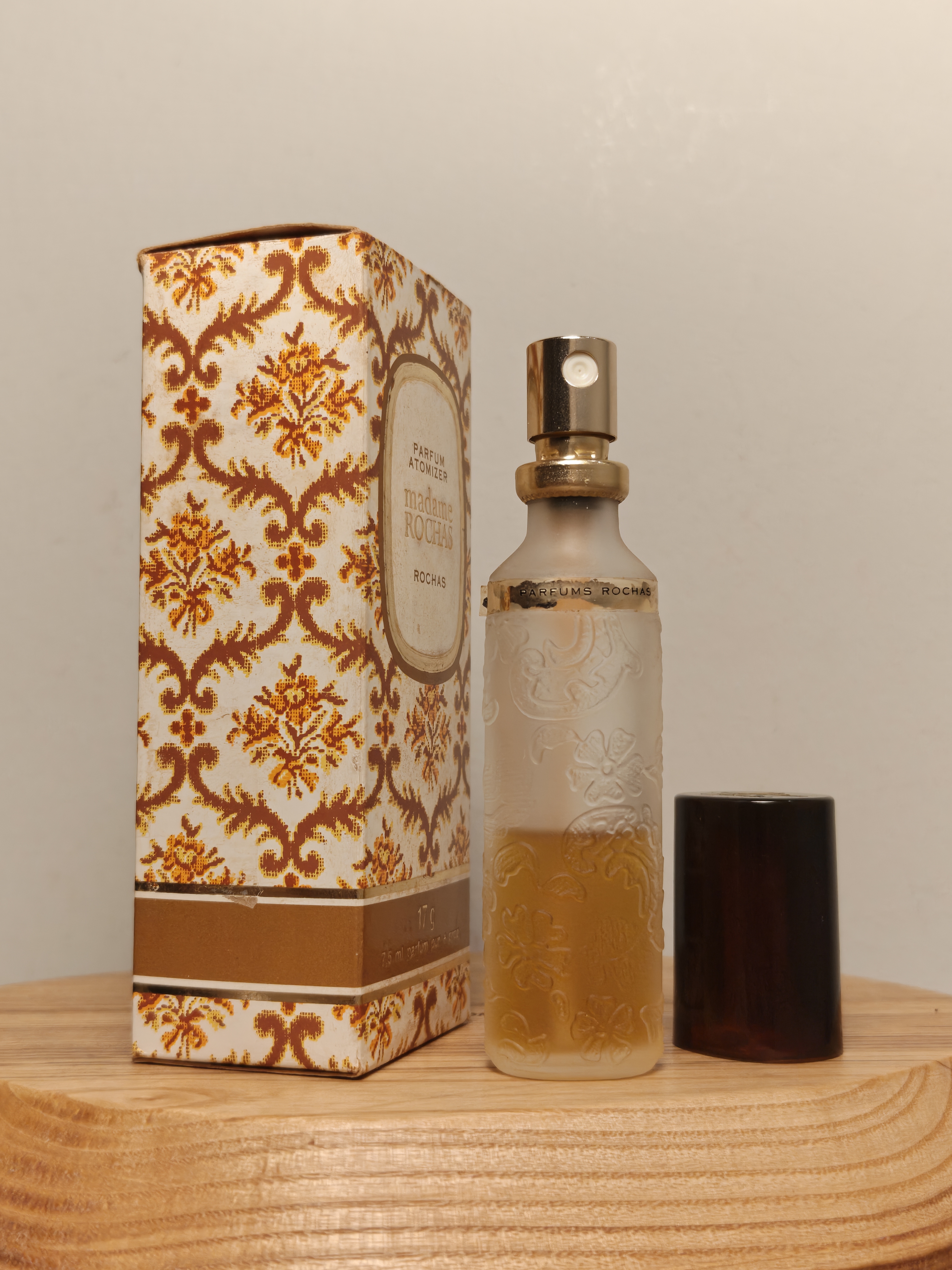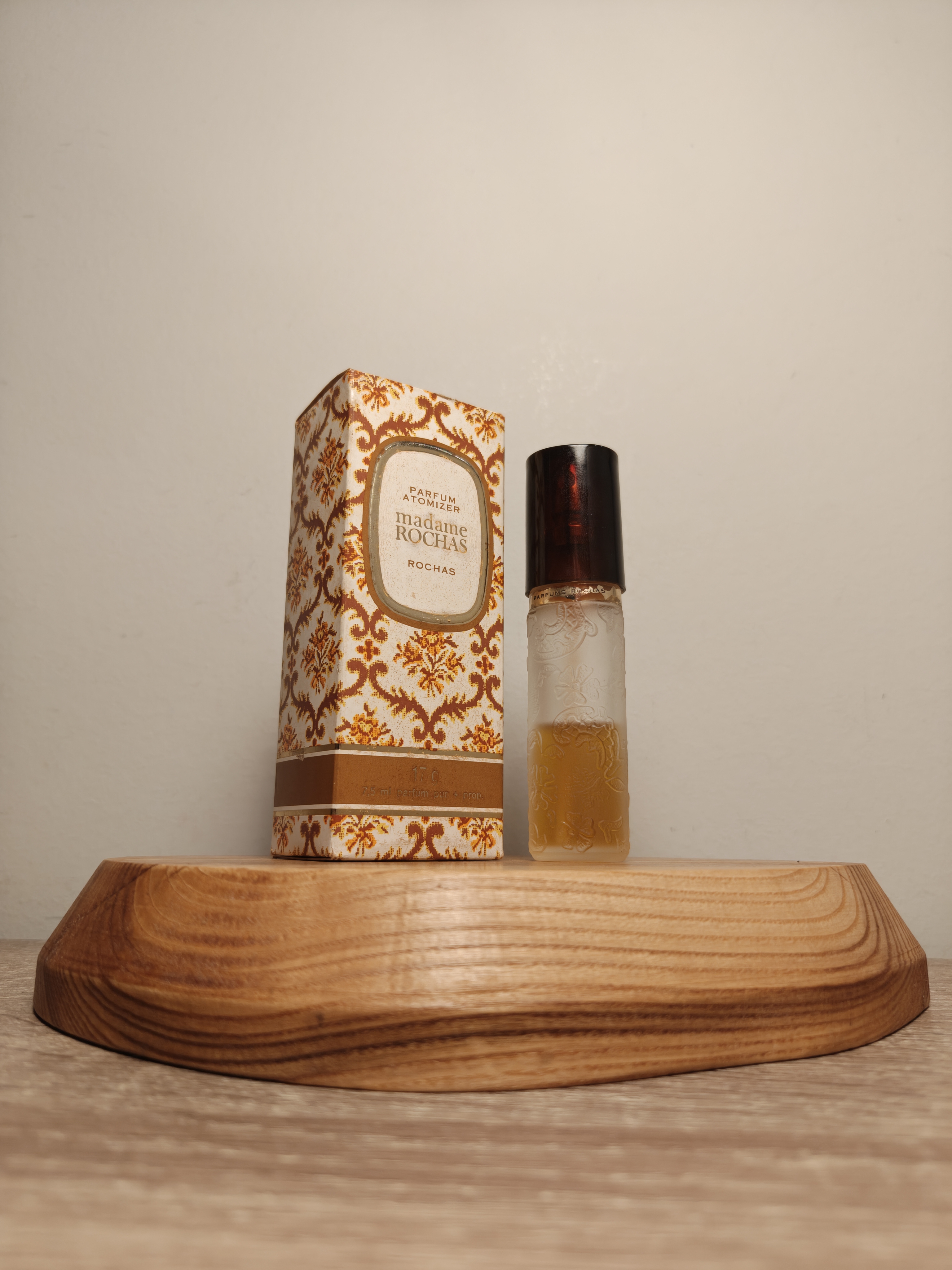 Утончённые винтажные духи Rochas Madame Rochas (Роша Мадам Роша) объёмом 7,5 мл 1978 года выпуска, флакон спрей-атомайзер (пульверизатор: парфюм + газ).