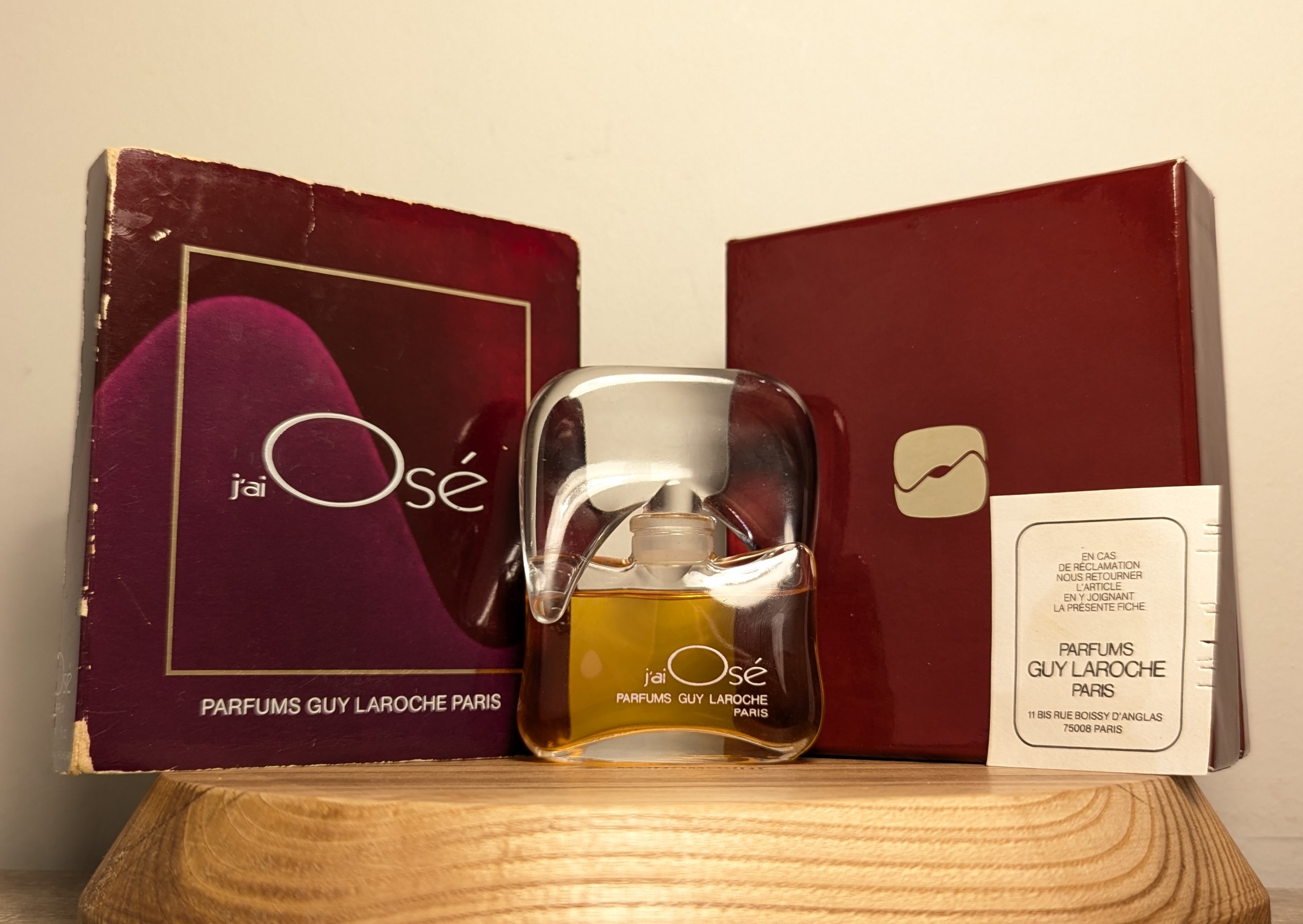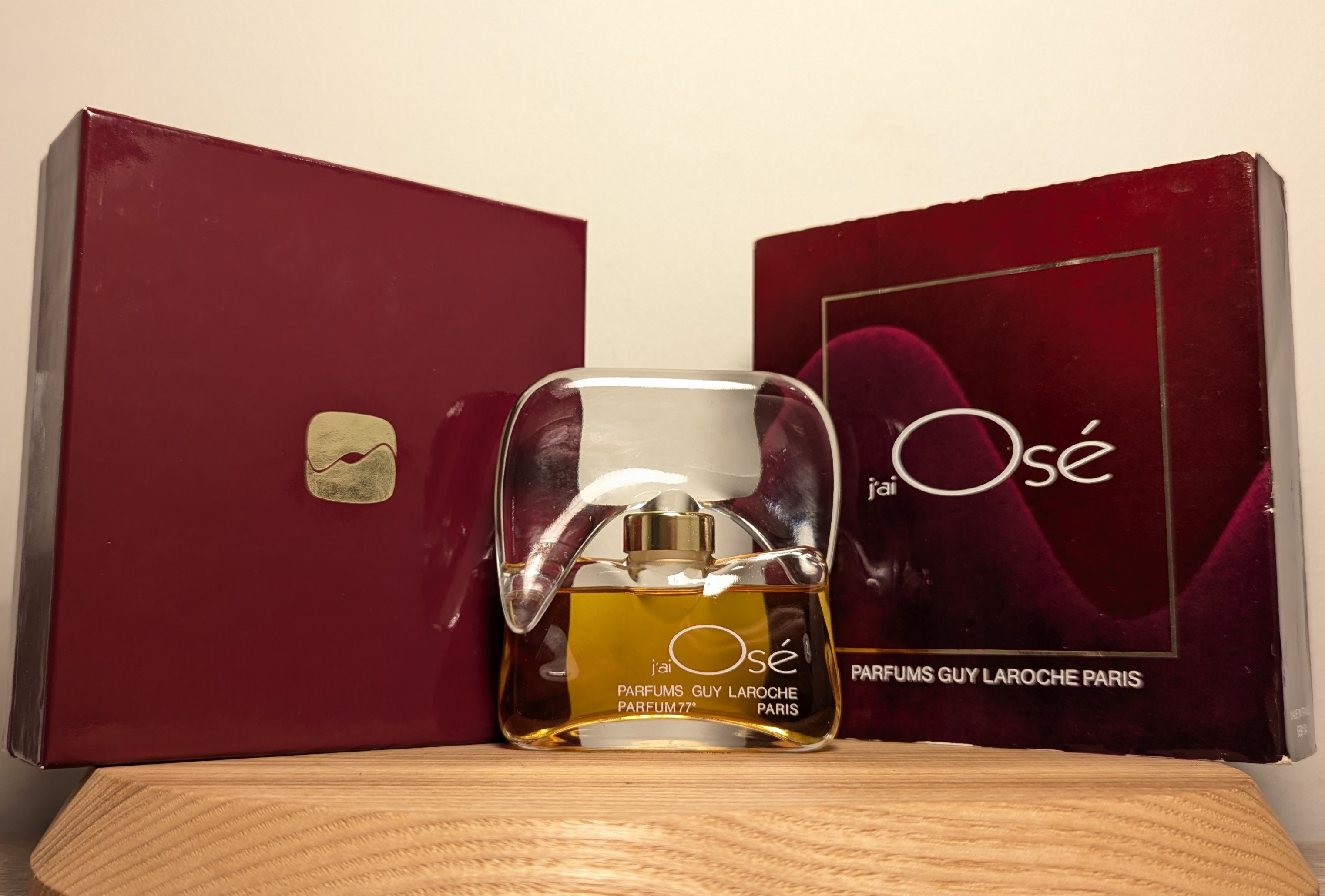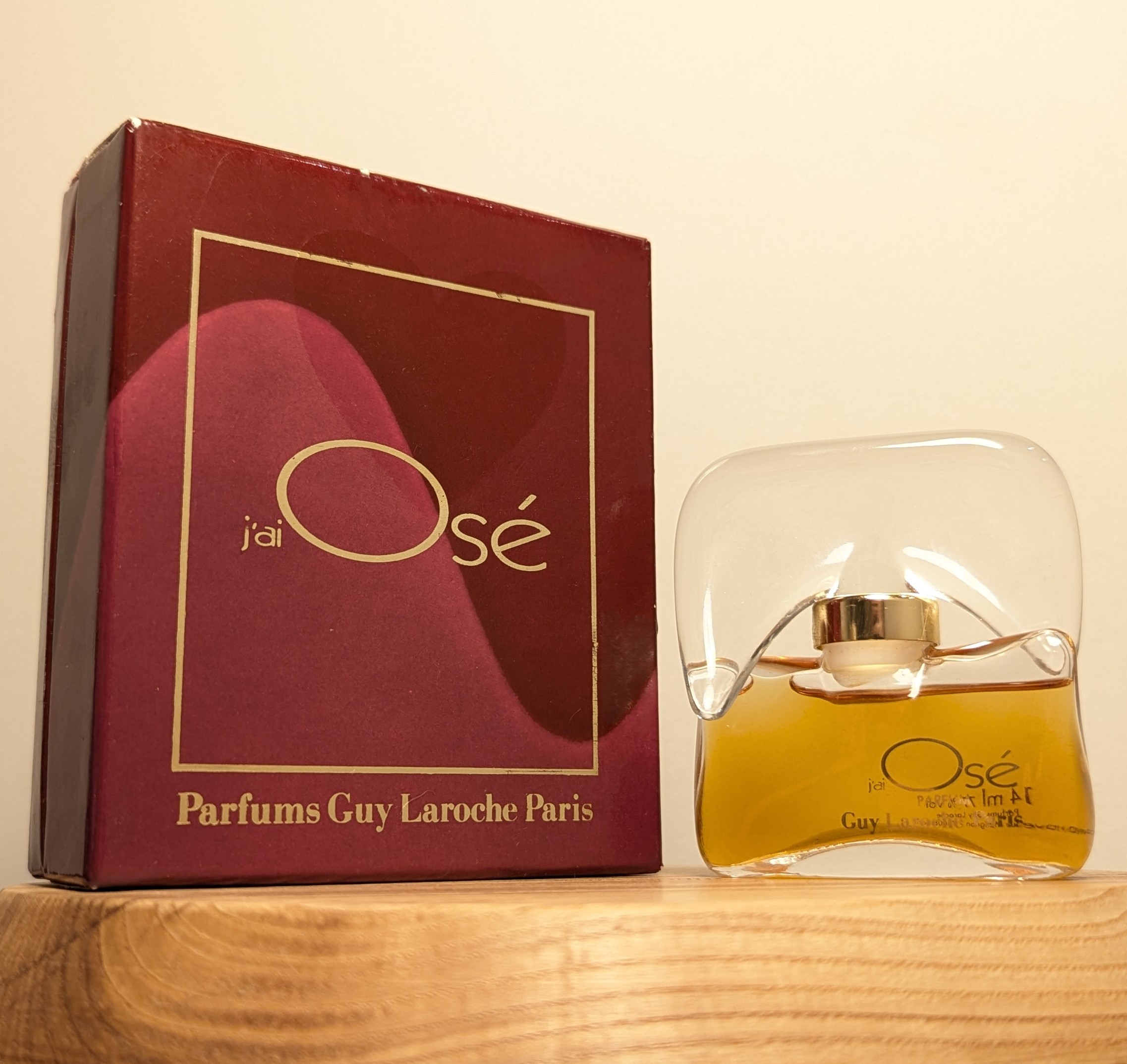 1. Первый, самый ценный, выпуск. В комплекте две коробочки: на внешней коробке надписи выполнены белыми буквами, а на внутренней изображена золотая пиктограмма, по форме напоминающая флакон J'ai Osé, известный также как "шляпа Наполеона". У флакона ещё нет золотого кольца на горлышке, верхняя часть пробки идеально гладкая, а надписи белые, как и на внешней коробочке. До 1981 года Guy Laroche ещё не использовал батч-коды, поэтому для первого выпуска также характерно отсутствие батч-кода как на коробках, так и на флаконе.