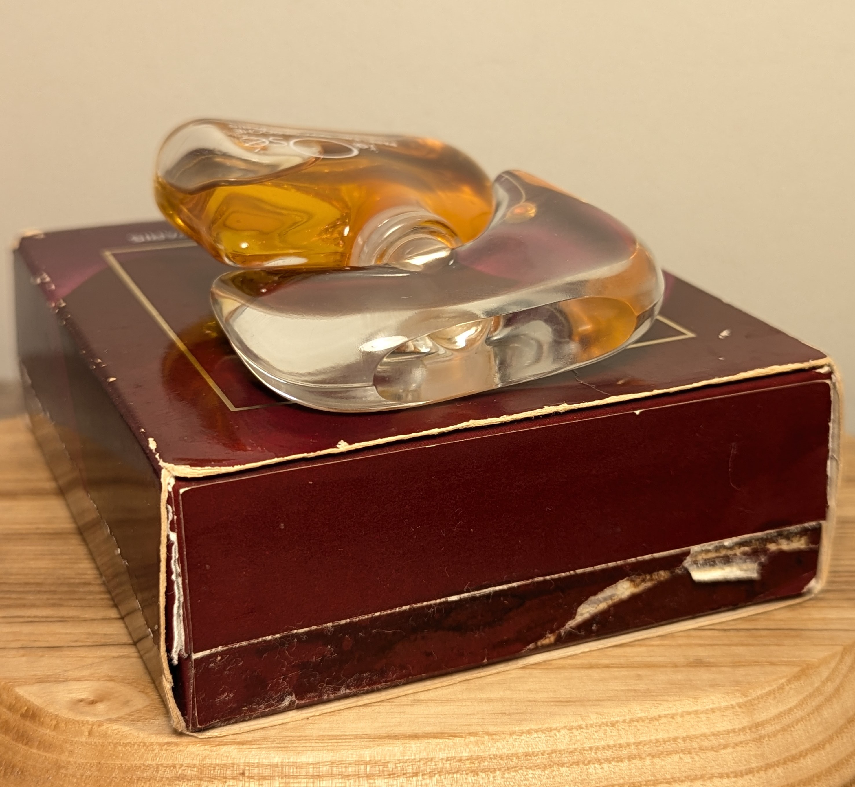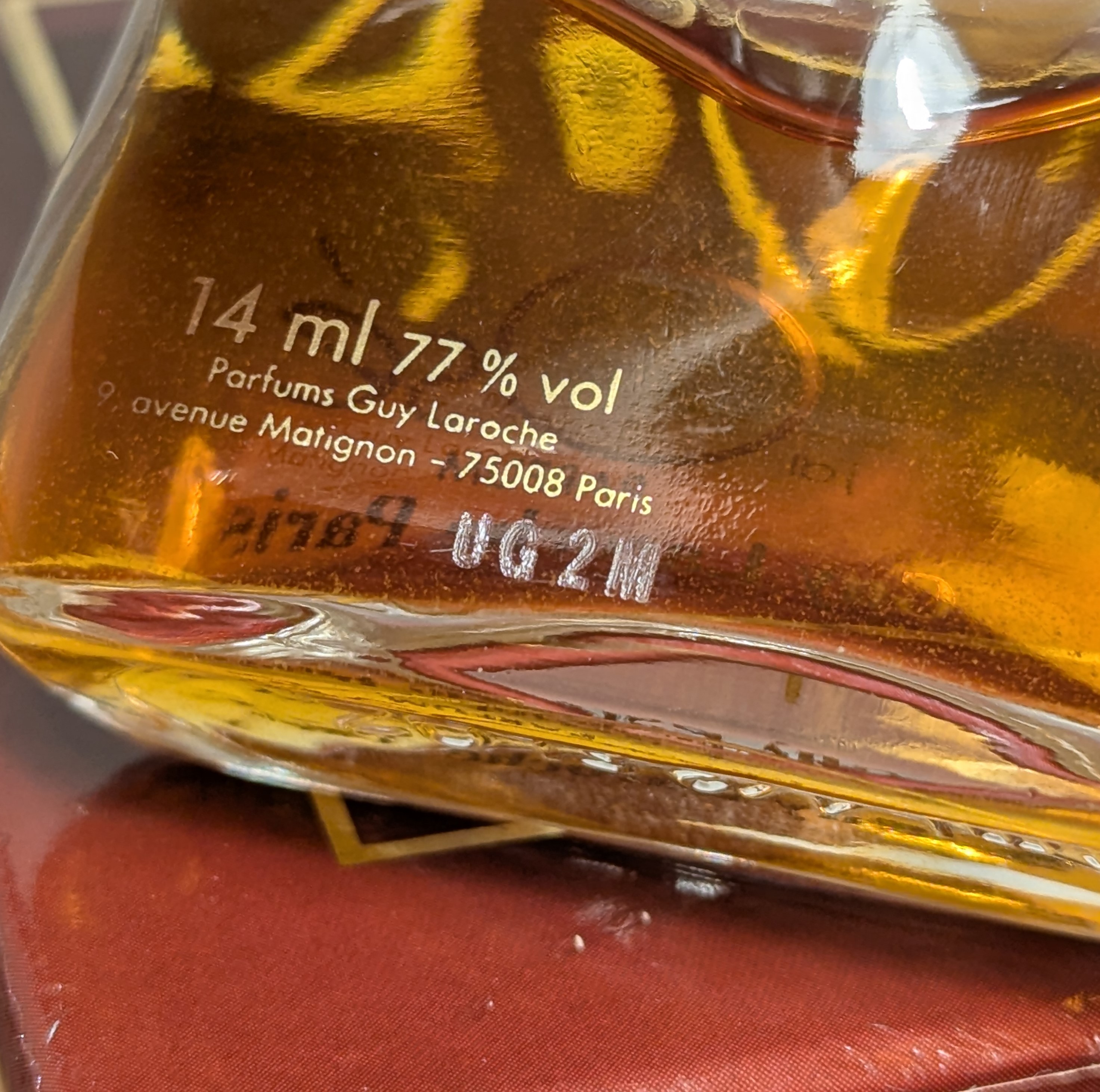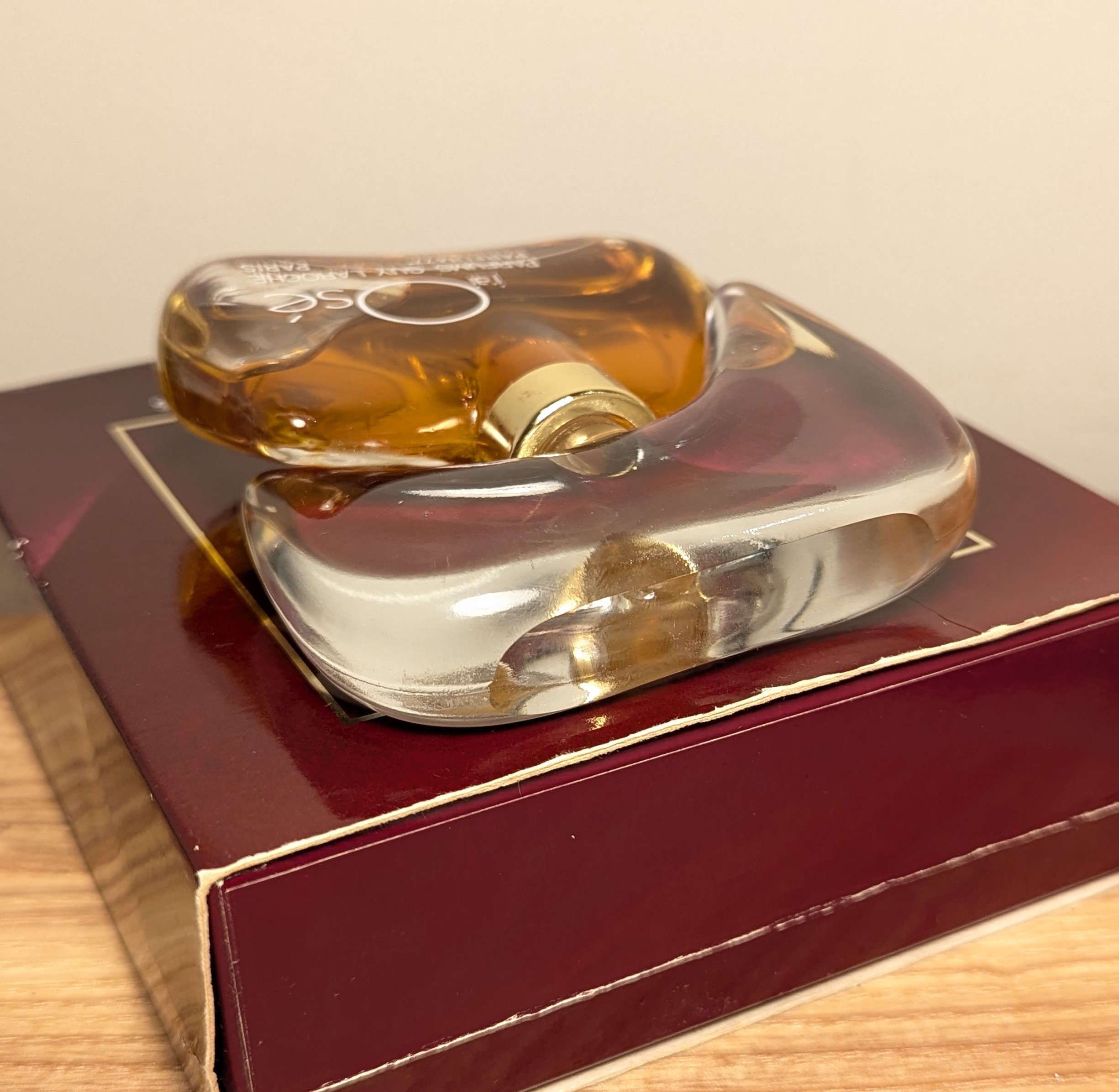 1. Первый, самый ценный, выпуск. В комплекте две коробочки: на внешней коробке надписи выполнены белыми буквами, а на внутренней изображена золотая пиктограмма, по форме напоминающая флакон J'ai Osé, известный также как "шляпа Наполеона". У флакона ещё нет золотого кольца на горлышке, верхняя часть пробки идеально гладкая, а надписи белые, как и на внешней коробочке. До 1981 года Guy Laroche ещё не использовал батч-коды, поэтому для первого выпуска также характерно отсутствие батч-кода как на коробках, так и на флаконе.